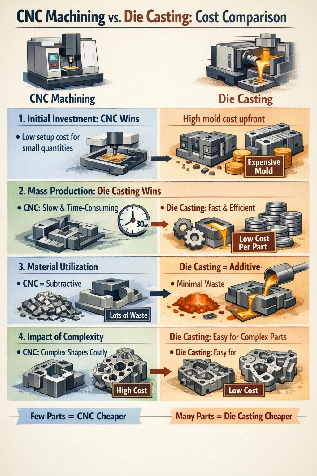 ความเร็วเป็นตัวกำหนดต้นทุน: การหล่อขึ้นรูปสามารถ "ผลิต" ชิ้นส่วนได้ภายในไม่กี่วินาที ในขณะที่ CNC อาจใช้เวลาครึ่งชั่วโมงในการทำงานอย่างพิถีพิถัน เวลาคือเงิน และในการผลิตขนาดใหญ่ ประสิทธิภาพของแม่พิมพ์หล่อสามารถลดต้นทุนต่อหน่วยให้ต่ำลงได้