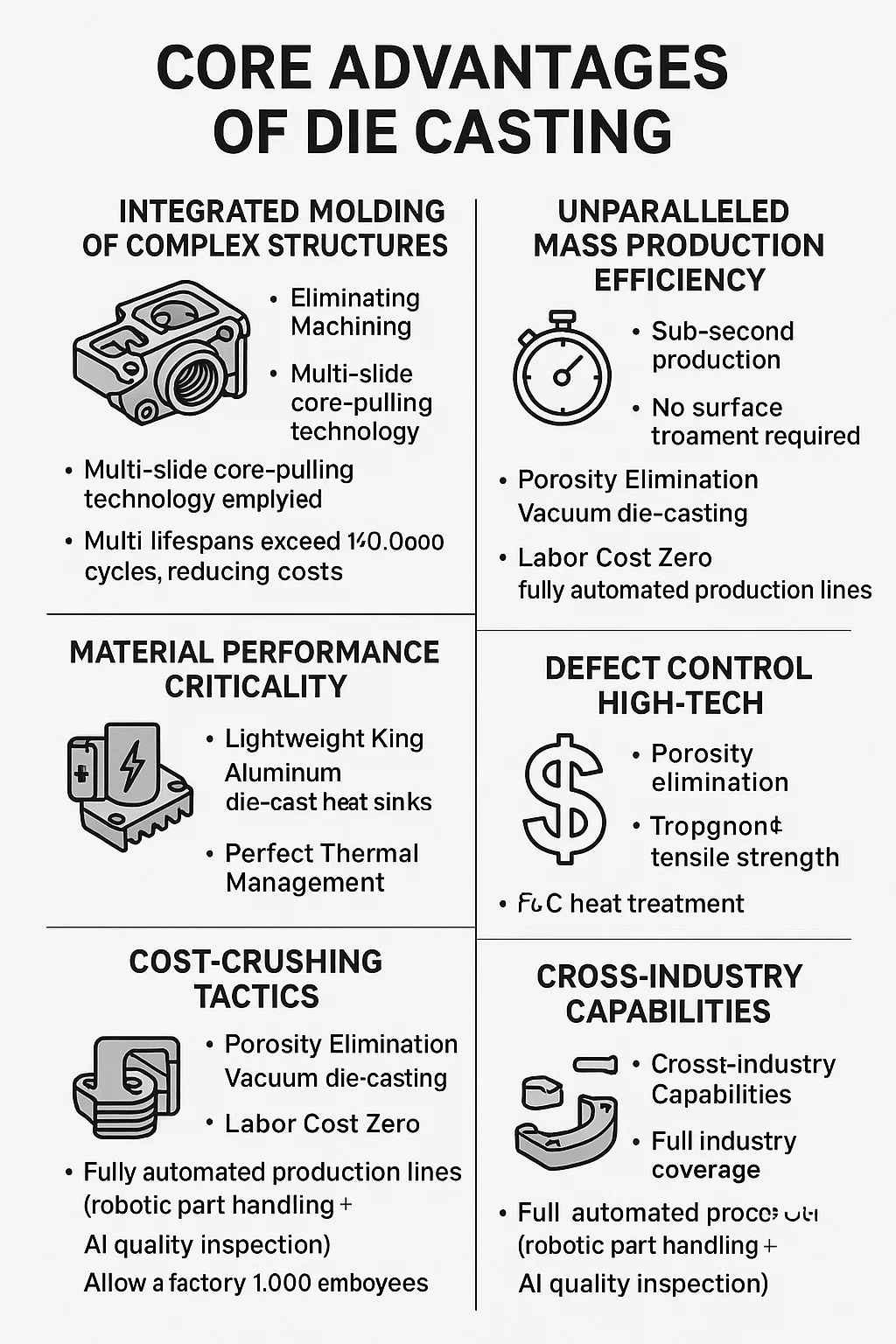 ตั้งแต่เฟืองโลหะผสมสังกะสีขนาดเล็กเพียง 0.1 กรัม (กลไกของนาฬิกา) ไปจนถึงตัวเรือนมอเตอร์ยานยนต์พลังงานใหม่ขนาดใหญ่ถึง 50 กก.