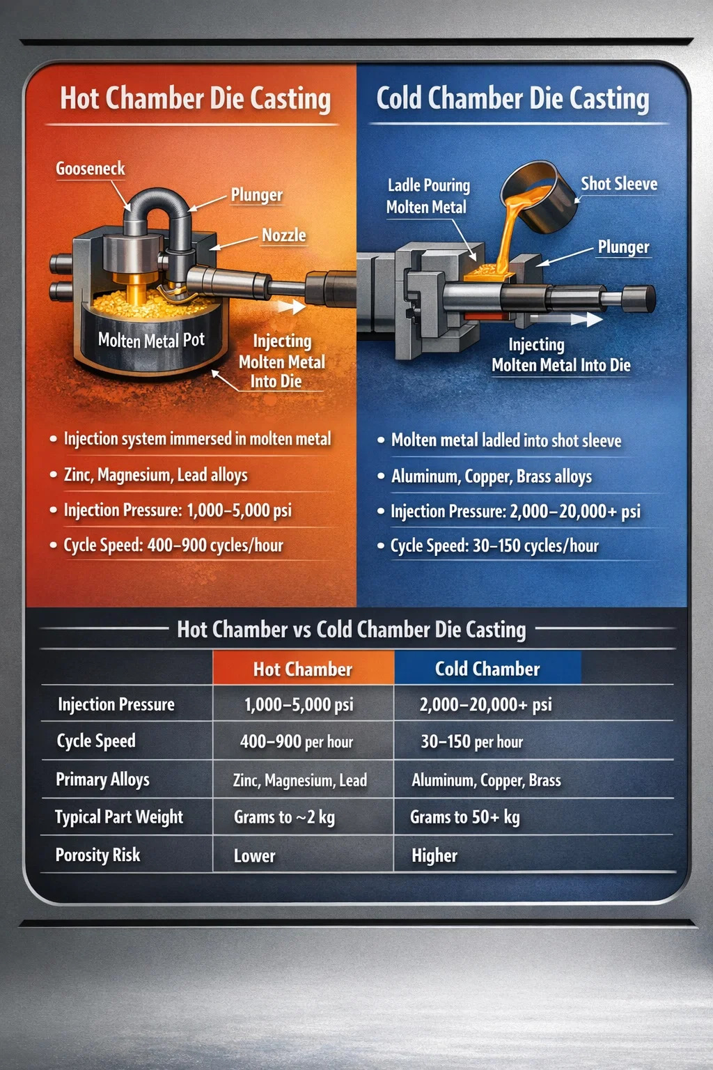 วิธีการหล่อแบบพื้นฐานมี 2 วิธีคือ ห้องหล่อร้อน และ ห้องเย็นหล่อตาย . กระบวนการทั้งสองนี้มีเป้าหมายพื้นฐานเดียวกัน นั่นคือการบังคับโลหะที่หลอมละลายให้กลายเป็นแม่พิมพ์เหล็กชุบแข็งภายใต้แรงดันสูงเพื่อผลิตชิ้นส่วนที่แม่นยำและทำซ้ำได้ แต่จะแตกต่างกันอย่างมากในวิธีการหลอม จัดการ และฉีดโลหะ การเลือกวิธีการสำหรับโลหะผสมหรือรูปทรงชิ้นส่วนที่ไม่ถูกต้องอาจส่งผลให้การเติมไม่ดี ความพรุนมากเกินไป การสึกหรอของแม่พิมพ์ก่อนกำหนด และอัตราเศษที่มีราคาแพง การทำความเข้าใจว่าอะไรที่ทำให้ทั้งสองวิธีนี้แยกจากกันเป็นจุดเริ่มต้นสำหรับการตัดสินใจเรื่องการหล่อแบบจริงจัง