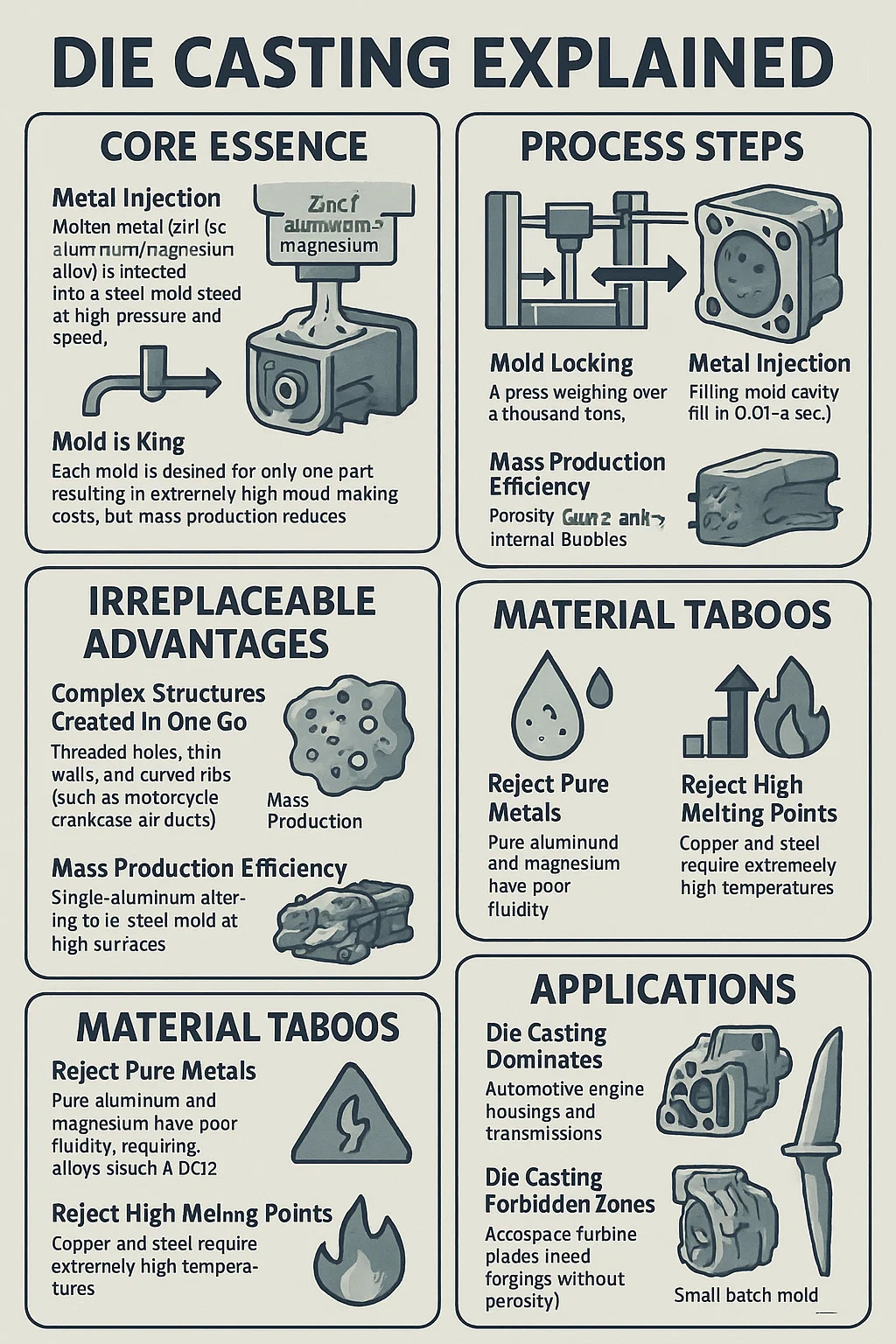 การฉีดขึ้นรูปโลหะ: โลหะหลอมเหลว (โลหะผสมสังกะสี/อลูมิเนียม/แมกนีเซียม) ถูกฉีดเข้าไปในแม่พิมพ์เหล็กที่ความดันและความเร็วสูงและพุ่งออกมาหลังจากเย็นลงเพื่อสร้างชิ้นส่วน