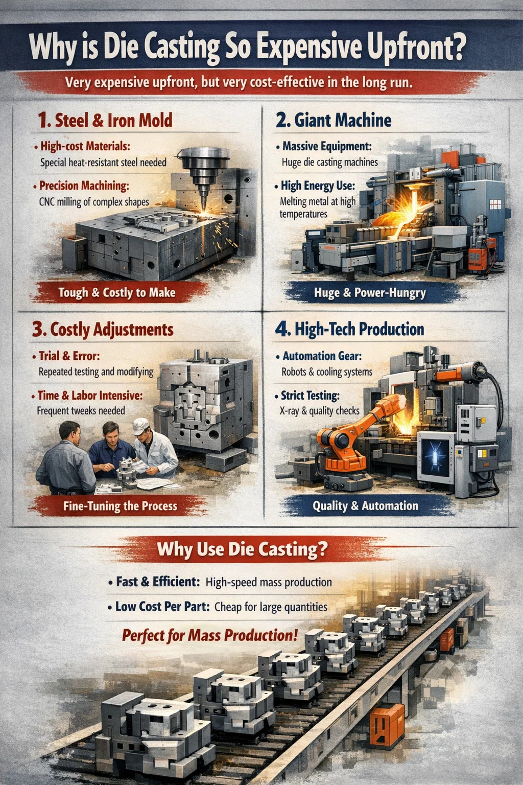 วัสดุราคาแพง: แม่พิมพ์เหล่านี้ต้องทำจากเหล็กทนความร้อนชนิดพิเศษที่มีราคาแพงมาก มิฉะนั้นจะเสียรูปหรือแตกร้าวหลังจากใช้งานเพียงไม่กี่ครั้ง